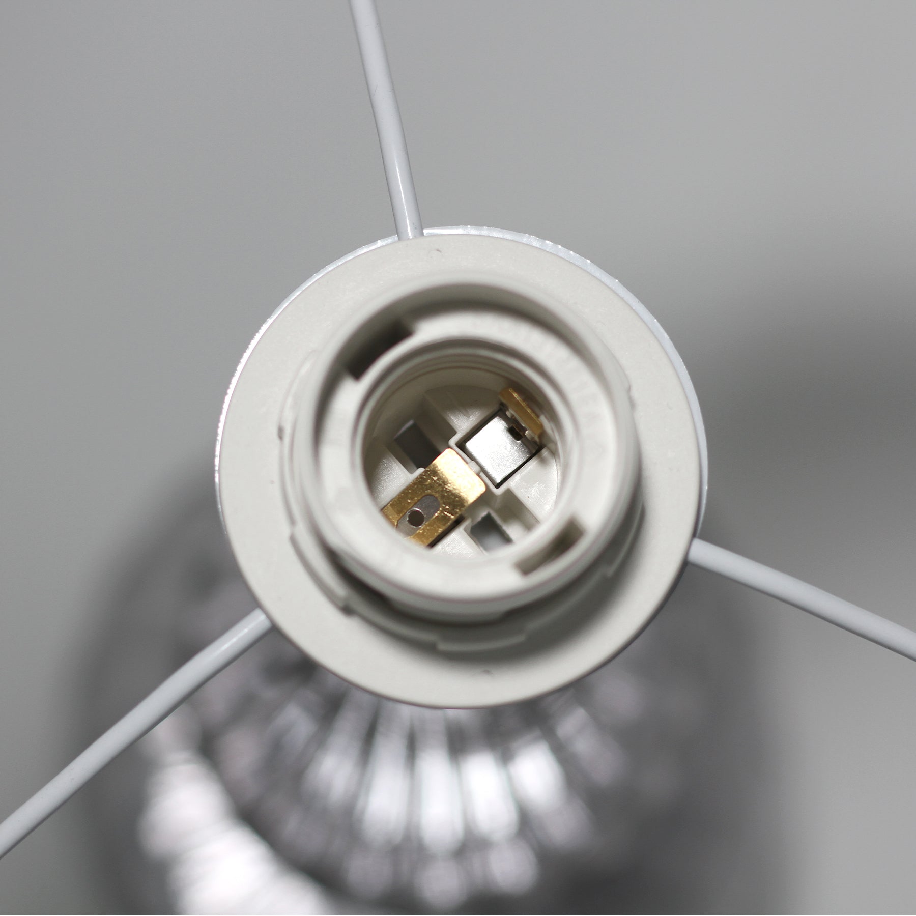 - Materials: Metal base, Clear glass stem, Linen Shade